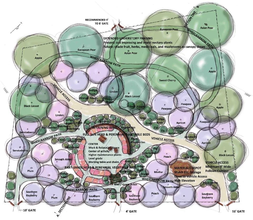 A family with a property high on a ridge in Shenandoah wanted a forest garden with plenty of room for medicinal herbs and fruit. The design for this steep site emphasizes holding and building soil with retaining logs throughout.