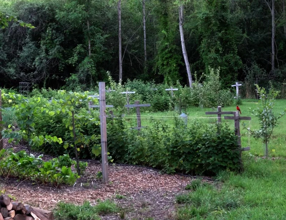 3 acres of dense young woodland with lots of invasive Buckthorn was carefully opened up to create this new forest garden. It features several varieties of apple and pear, unusual fruits, cane fruits for preserves, and room for lots of annual veggies.